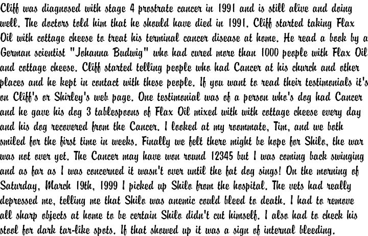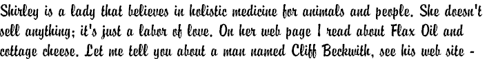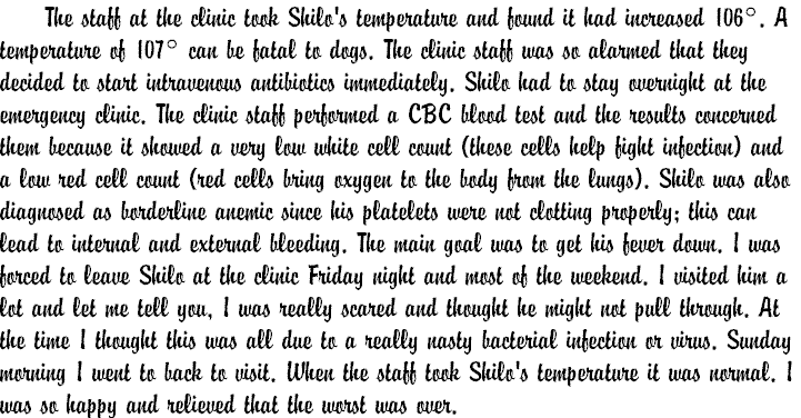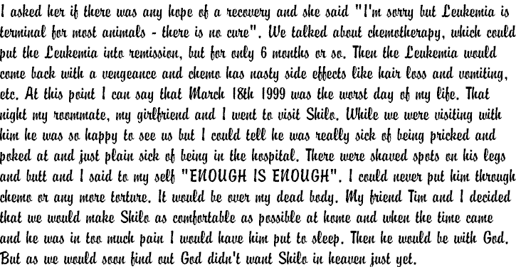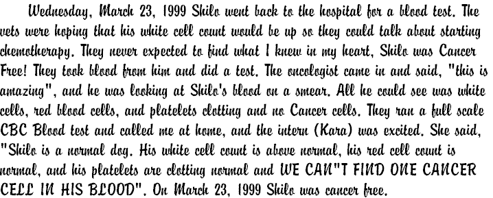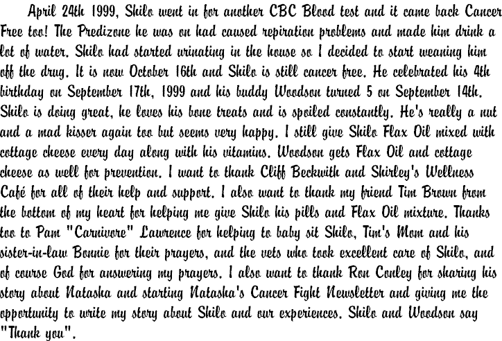 September 19, 2000: Hi everyone! Shilo and Woodson are doing great. Shilo had a CBC blood test done in March 2000 and everything was good. Shilo is still taking Flaxseed Oil and Cottage Cheese plus his vitamins, and so is Woodson. Everyone that sees Shilo and Woodson comment on how healthy they look. Shilo just celebrated his 5th birthday. He was born Sept 17th, 1995 and Woodson was born on Sept 14, 1994. I am having a little party for them this weekend {Pig Ears, Bones, and a Dairy Queen Cake}. (To the Conleys:) I hope you and your family are doing fine. I am glad to hear that Natasha is doing pretty good considering her age. (Natasha says some people should stop while they are ahead). Shilo and Woodson think she's a pretty Hot Babe so tell Natasha that . (Well, Natasha decided Kirk's Ok after all). Take care , Kirk