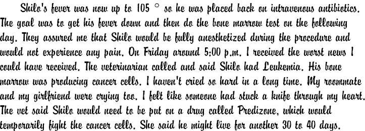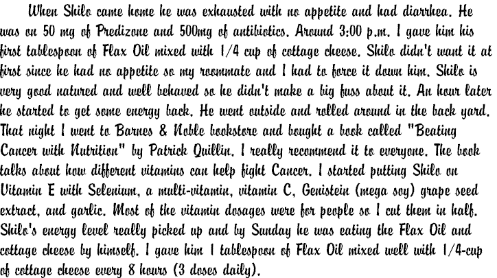 August 19, 2003: Shilo and Woodson are doing really well. Shilo is still getting his flaxoil and vitamins with his cottage cheese. Take care, Kirk Heckel