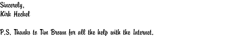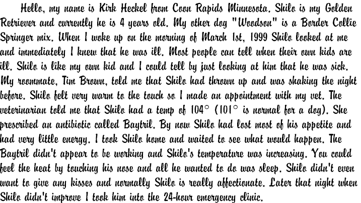 February 10, 2007: Ron, How are you? Shilo is doing great. So is Woodson. Shilo is now 11 and Woodson is 12. I live in Minnesota and man it is cold!! Shilo and Woodson don't care they demand their walk in the park. Their like little kids, if they don't get it they pout. Shilo and Woodson are still on their flaxoil and cottage cheese and vitamins. They are getting older but their healthy. Thanks again for doing such a great job on Shilo's webpage. I have a new email address [email protected]. If you have any questions please write back. I hope you and your family are healthy and doing fine. Take care, Kirk Heckel